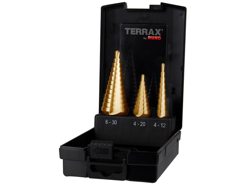 › Nástroje › Nástroje do kovu › Vrtáky stupňovité › RUKO Sada stupňovitých vrtáků do kovu Terrax Tin | 4-12, 4-20, 6-30 mm