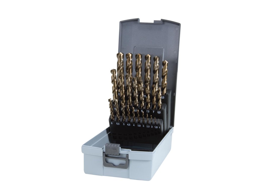 Sada 25 šroubovitých vrtáků DIN 338 typu N. 1-13 mm v řadě po 0,5 mm. Vrtáky jsou uloženy v plastovém boxu.