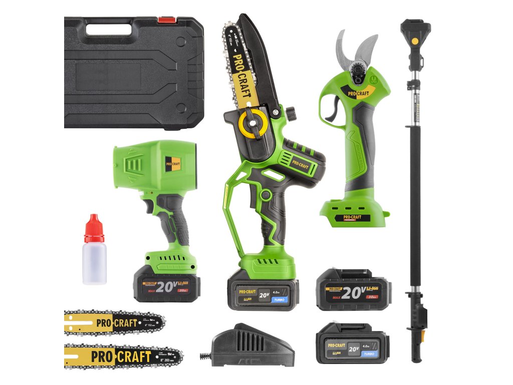 Tato komplexní sada Procraft nabízí vše, co potřebujete pro komfortní, rychlou a přesnou údržbu zahrady. Obsahuje výkonnou aku ruční pilku PKA32Li pro řezání větví, silové aku nůžky ES28LiBB pro čisté střihy, lehký a mobilní aku fukar PB18 pro úklid a praktický prodlužovací nástavec EP2.0, který umožňuje bezpečně dosáhnout i na vyšší větve bez žebříku.