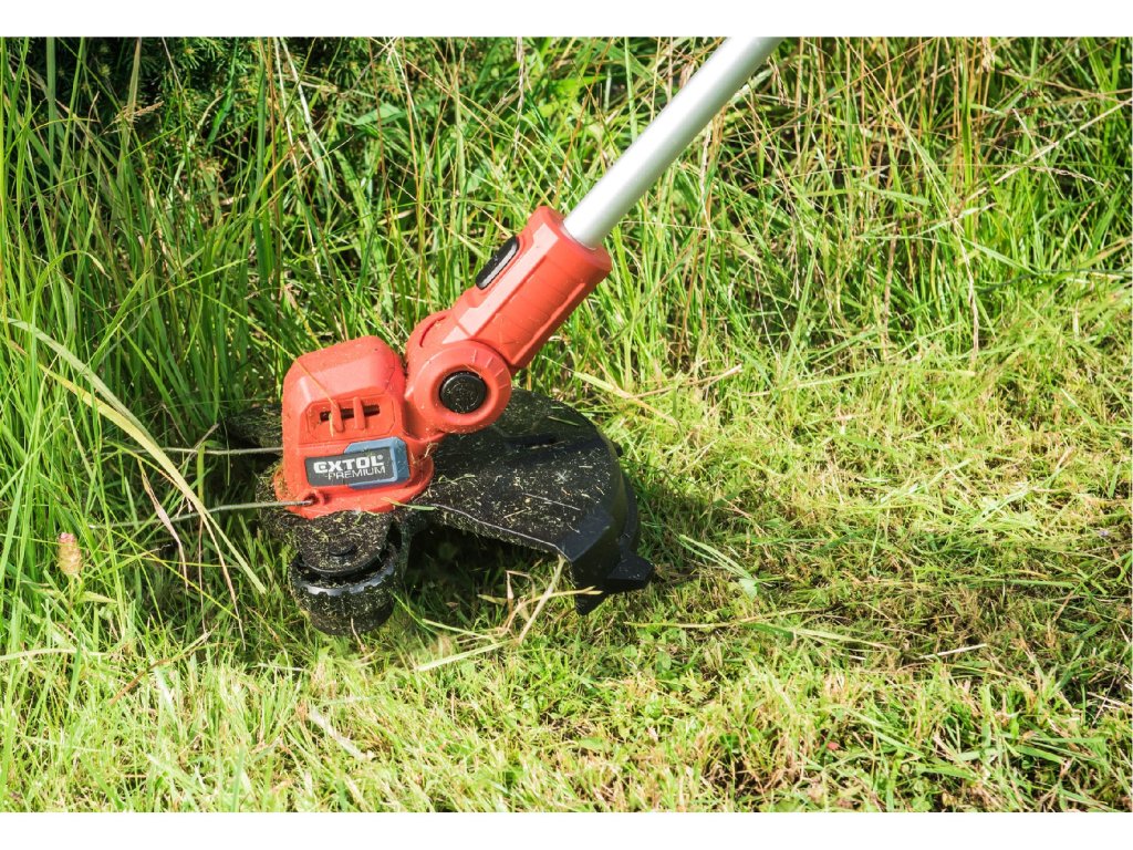 Strunová aku sekačka je určena k udržování zahradního trávníku, k úpravě okrajů trávníku a sekání trávy v těžko přístupných místech, např. u obrubníků, pod lavičkami, kolem stromů a keřů apod., které je obtížné či nemožné vysekávat pojízdnou sekačkou. Na hlavě sekačky si můžete nastavit její úhel a také ji otočit o 180° což usnadňuje sekání u okrajů trávníků, podél chodníků, příjezdových cest apod. Rukojeť sekačky lze prodloužit až o 23cm, takže s ní mohou pohodlně sekat lidé všech velikostí. Strunu lze prodloužit buď manuálně stiskem tlačítka na sekací hlavě nebo při práci, poklepem o zem. Ochranný kryt struny je vybaven nožem, který automaticky ořízne strunu na patřičnou délku. Díky napájení z baterie již není nutné dávat pozor na napájecí kabel, sekačka je tak lehčí a manipulace s ní pohodlnější. Pogumovaná rukojeť brání vysmeknutí, tlumí vibrace a zpříjemňuje držení při práci. Sekání podél plotů, zdí nebo stromů usnadňuje sklopitelný distanční oblouk, který zároveň šetří sekací strunu. Všechny akumulátory jsou vybaveny ukazatelem nabití, což umožňuje uživateli si rozvrhnout délku práce a dát si včas nabít další akumulátor. Díky Li-ion akumulátoru je možné sekačku kdykoliv dobíjet, aniž by se tím snižovala kapacita akumulátoru. Li-ion akumulátor také ztrácí energii vlivem samovybíjení velmi pomalu a vydrží dlouho nabitý.Doplňkové parametry