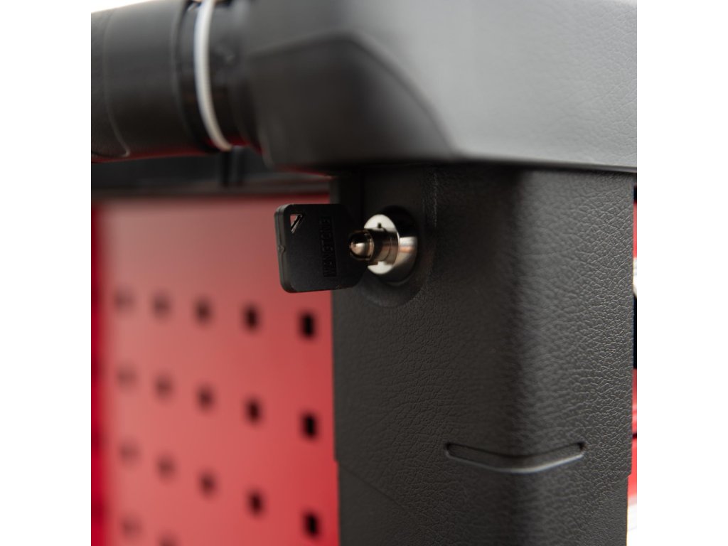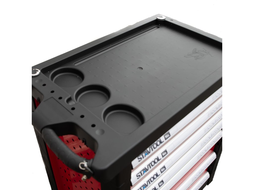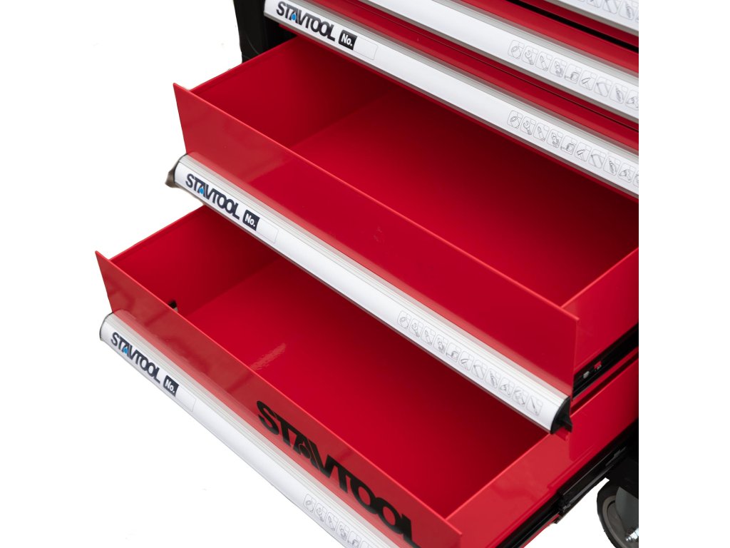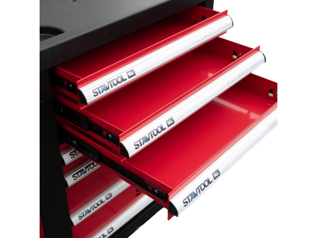Kovový montážní vozík na nářadí se 7 zásuvkami. Dvě pevná a dvě otočná kola s poziční brzdou. Zásuvky s kuličkovými ložisky lze vysunout do 40 cm. Horní pracovní plocha i zásuvky jsou vypodloženy protiskluzovou podložkou. Držadlo pro manipulaci s vozíkem lze umístit z pravé i levé strany. Součástí je 5 nízkých a 2 vysoké uzamykatelné zásuvky.