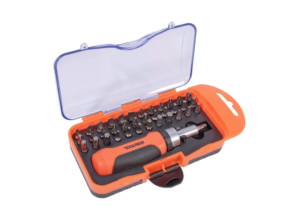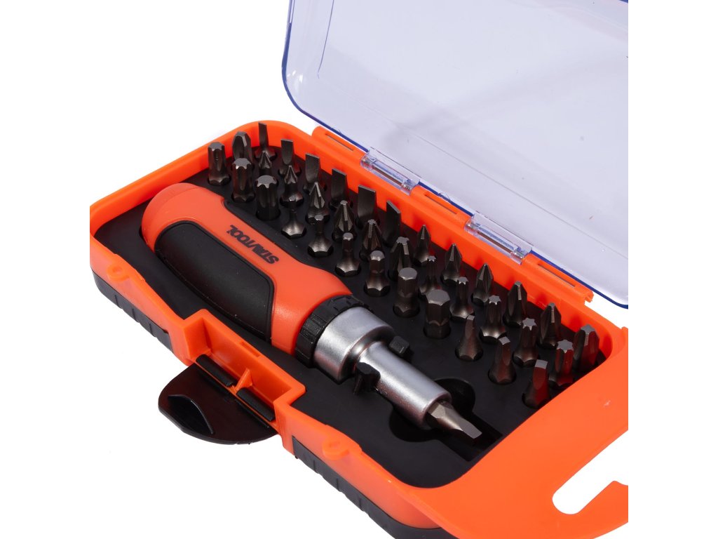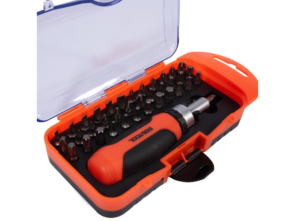 › Dílna › Bity, nástavce, adaptéry › Sada bitů › STAVTOOL Sada bitů s ráčnovým šroubovákem 1/4” 38 dílů