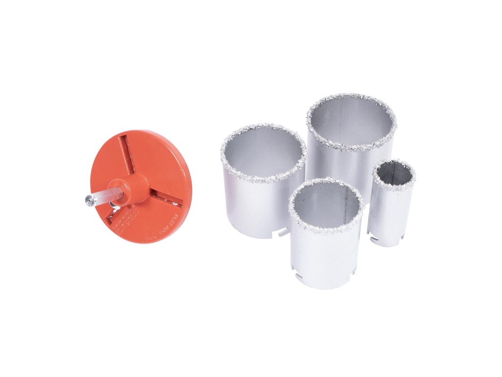 Sada obsahuje čtyři korunky průměrů 33 mm, 53 mm, 67 mm a 73 mm, dále vodicí vrták a unašeč pro bezpečné uchycení. Kvalitní diamantová vrstva zajišťuje dlouhou životnost a vysokou řeznou rychlost.