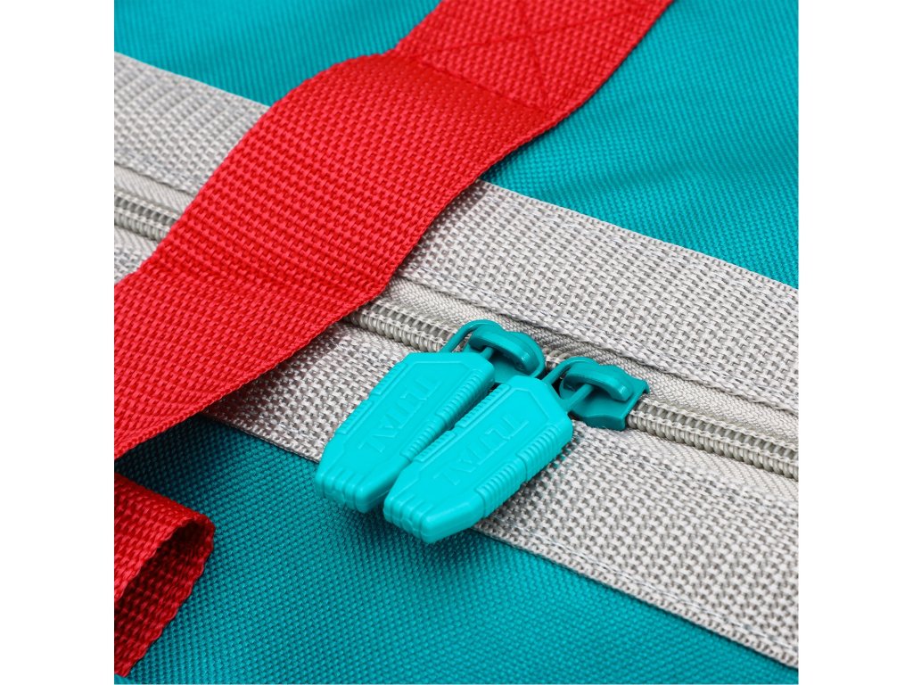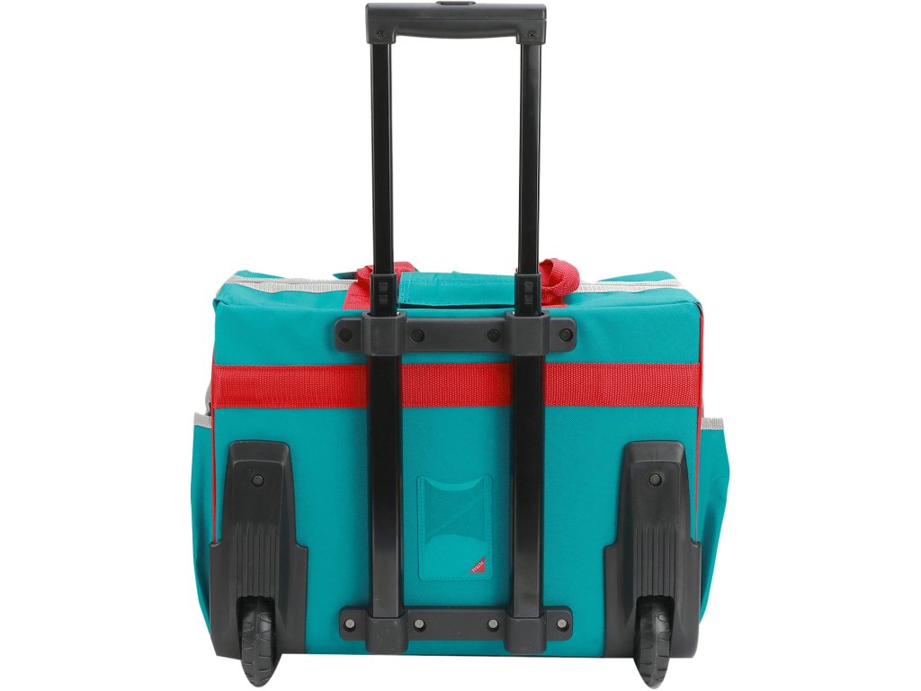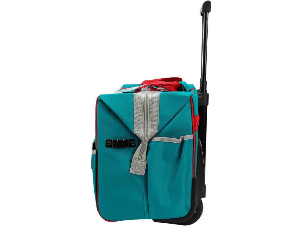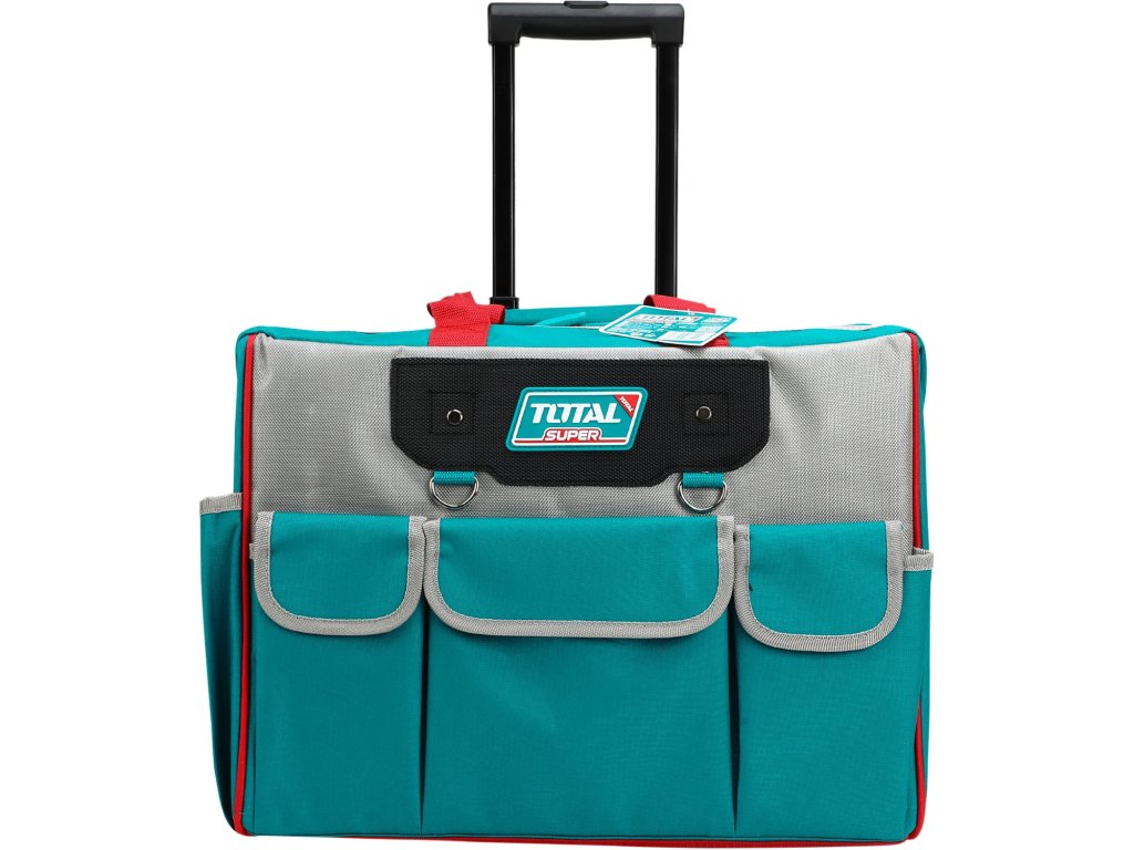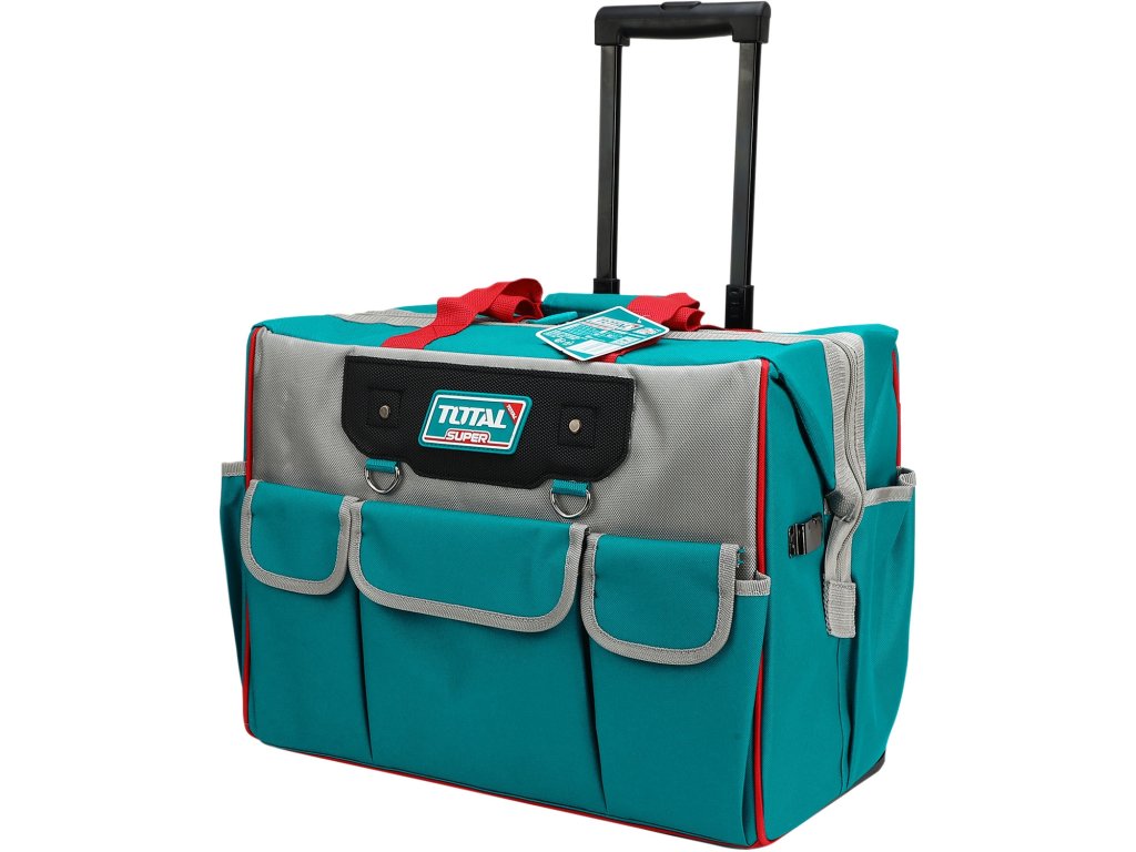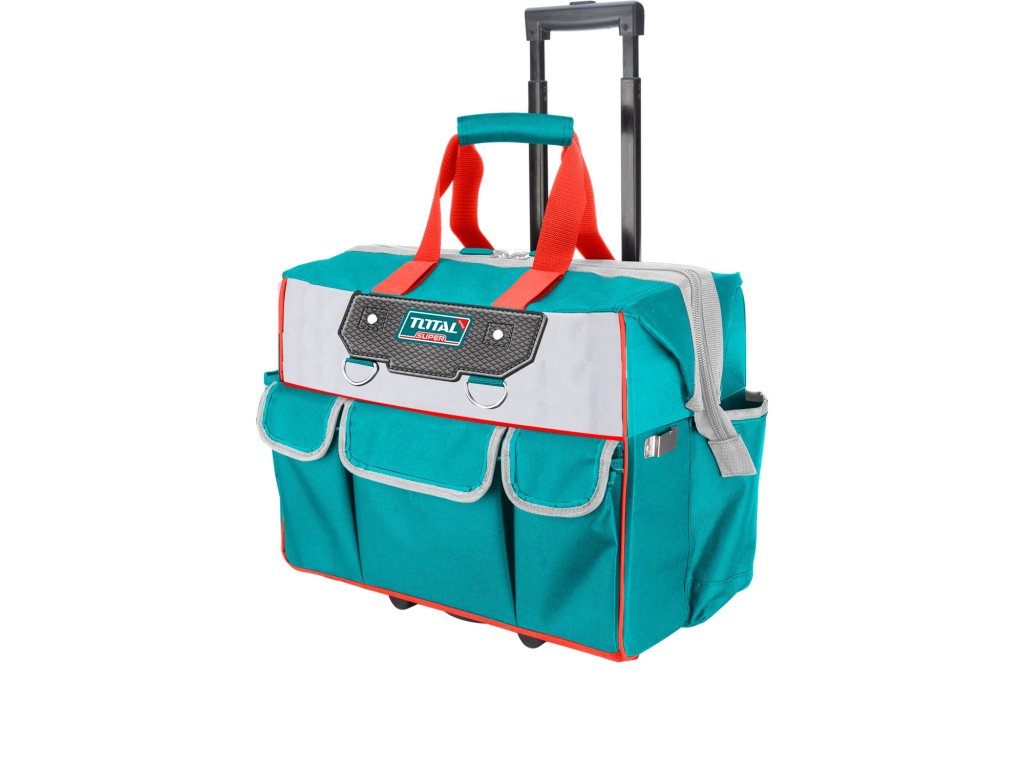 Taška na nářadí s šířkou 45cm. Taška je vybavena pojezdovými kolečky s polohovatelnou rukojetí. Vevnitř tašky je velký úložný prostor pro nářadí. Po stranách úložného prostoru je na jedné straně 7 a na druhé straně 6 kapes pro nářadí jako kleště, šroubováky atd.. Hlavní úložný prostor se otevírá nahoru po dvou stranách, což umožňuje lepší využití vnitřního prostoru. Uzavíratelné na zip. Na vnější čelní straně tašky jsou dvě menší a jedna větší kapsa na suchý zip. Z boku tašky jsou rovněž kapsy pro možné uskladnění nářadí. Taška je vybavena uchy pro pohodlné nošení. Materiál: 600D a 1680D polyester a materiál proti vlhkosti na stranách. Maximální nosnost 20kg, s kolečky a teleskopickou výsuvnou rukojetí. Délka, šířka, výška: 45x28x36cm. Pevný rám pro snadné otevírání a přístup.