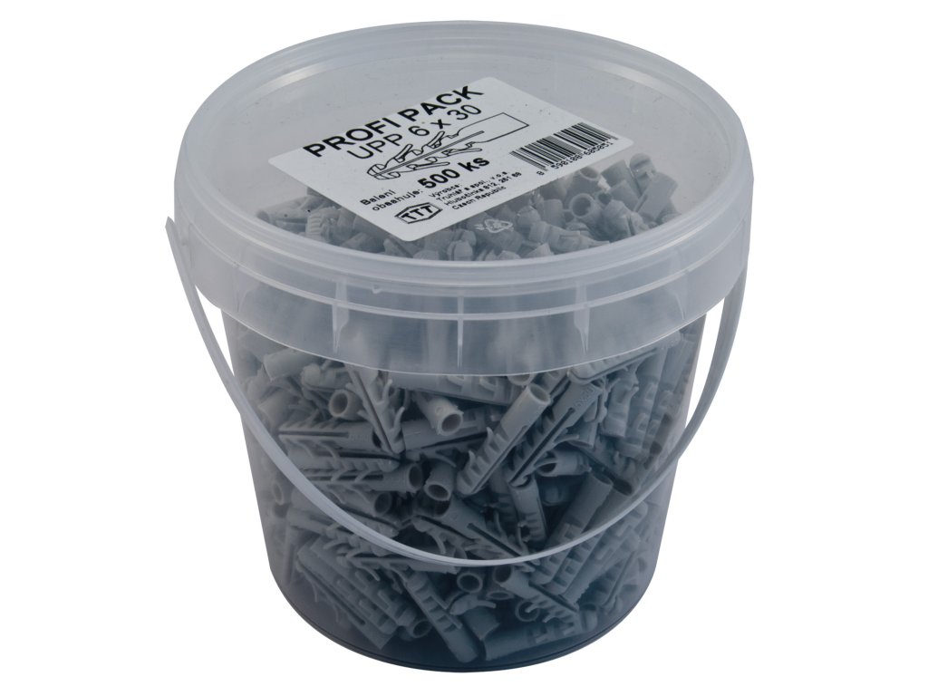 Sada universálních hmoždinek z polypropylenu v kyblíku s ouškem.