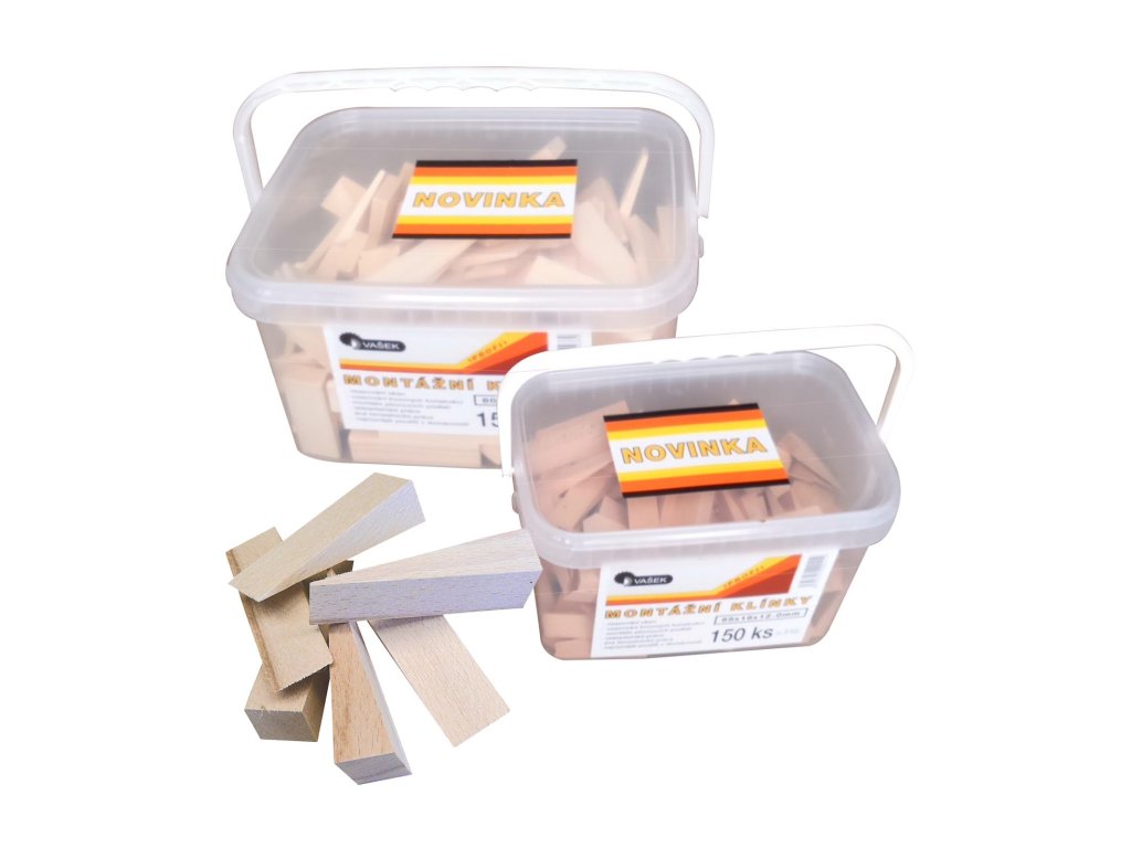 › Stavba › Ostatní stavební nářadí › Klínky, křížky, skoby, olovnice, spony › VAŠEK Klínky montážní dřevěné (vědro) | 150x25x25-1 mm 1bal/60ks
