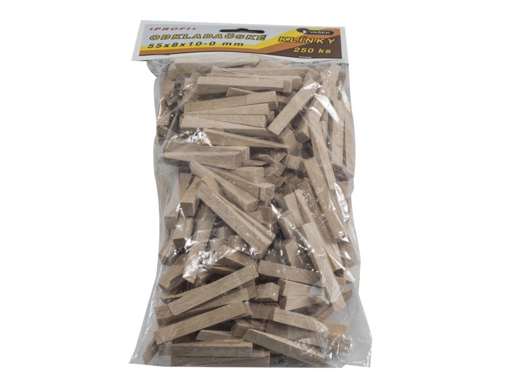 › Stavba › Ostatní stavební nářadí › Klínky, křížky, skoby, olovnice, spony › VAŠEK Klínky montážní dřevěné | obkladačské 55x8x10 mm 1bal/250ks