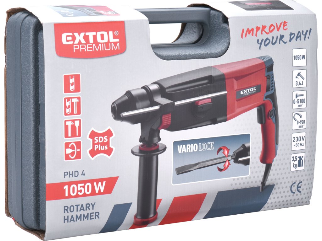 EXTOL PREMIUM kladivo vrtací SDS plus 8890250 je výkonný elektrický nástroj určený pro vrtání s příklepem a lehké sekací práce ve stavebních materiálech jako jsou beton, pórobeton, zdivo nebo kámen. Je konstruováno tak, aby poskytovalo spolehlivý výkon při každodenním používání jak v domácí dílně, tak na stavbě či při rekonstrukcích. Stabilní provoz je zajištěn výkonným elektromotorem s příkonem 1050 W, který se osvědčuje i při náročnějších úlohách.