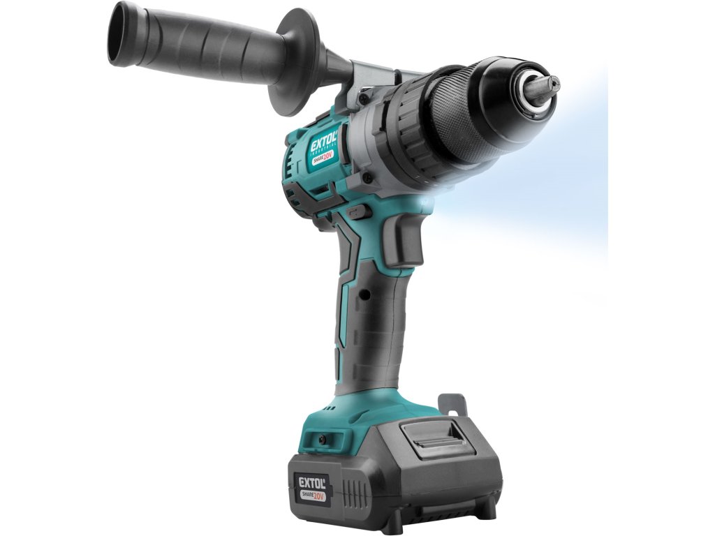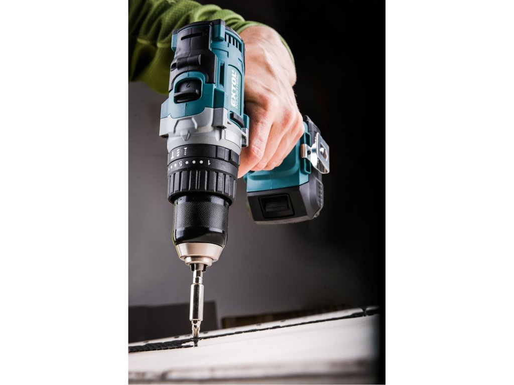 Lehký a výkonný dvourychlostní vrtací aku šroubovák s příklepem Vám poskytuje vysoký vrtací výkon při vrtání do široké škály materiálů – ocel, kovy, dřevo, plast, ale s příklepem také do zdiva. Je určen pro náročné práce a díky svému příjemnému designu se s ním velmi dobře pracuje i při dlouhodobém používání. Vrtačka je poháněná nejmodernějším „brushless" motorem. Tento nový typ motoru má vyšší životnost, je výkonnější a má menší spotřebu el. energie než klasické motory s uhlíkovými kartáči. Celokovová převodovka zajišťující bezchybný chod při i vysoké zátěži. Díky plynulému nastavení momentů, lze využít celý rozsah stupnice a nejen vyznačených 20 stupňů. Pro běžnou práci dostačují jeden nebo dva 2000mAh akumulátory, které můžete rychle nabít v rychlonabíječce, pro náročnější nebo delší práci doporučujeme větší akumulátory s kapacitou 4000–8000mAh. Akumulátor lze použít ve všech typech nářadí řady EXTOL SHARE20V. Díky použité Li-ion technologii je ho možné kdykoliv dobíjet, aniž by se tím snižovala jeho kapacita. Li-ion akumulátor ztrácí energii vlivem samovybíjení velmi pomalu a vydrží dlouho nabitý a připravený k použití.Doplňkové parametry