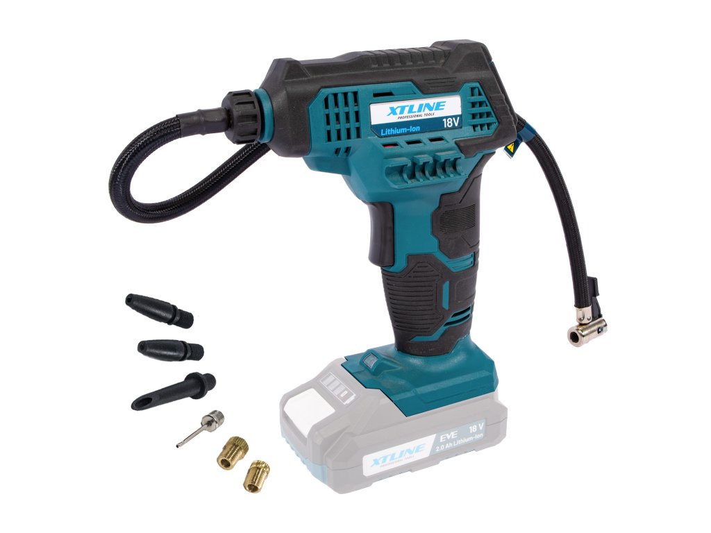 Praktický akumulátorový kompresor vhodný pro huštění pneumatik, sportovního vybavení i nafukovacích předmětů. Kompatibilní s 18V bateriemi XTline (není součástí).