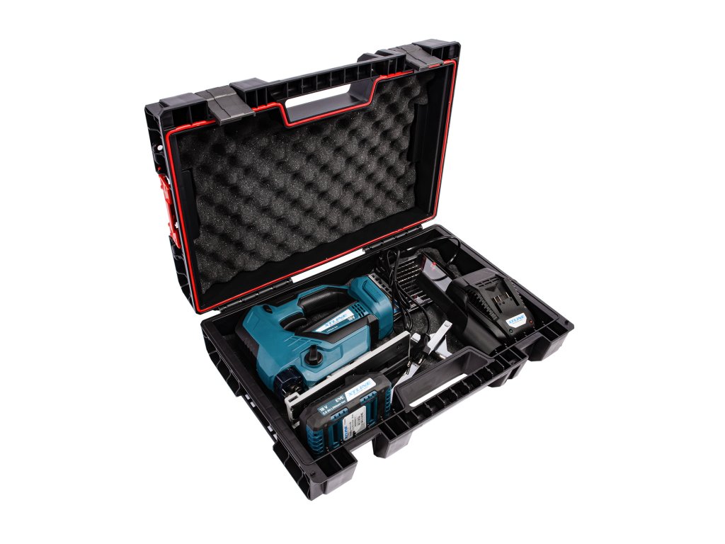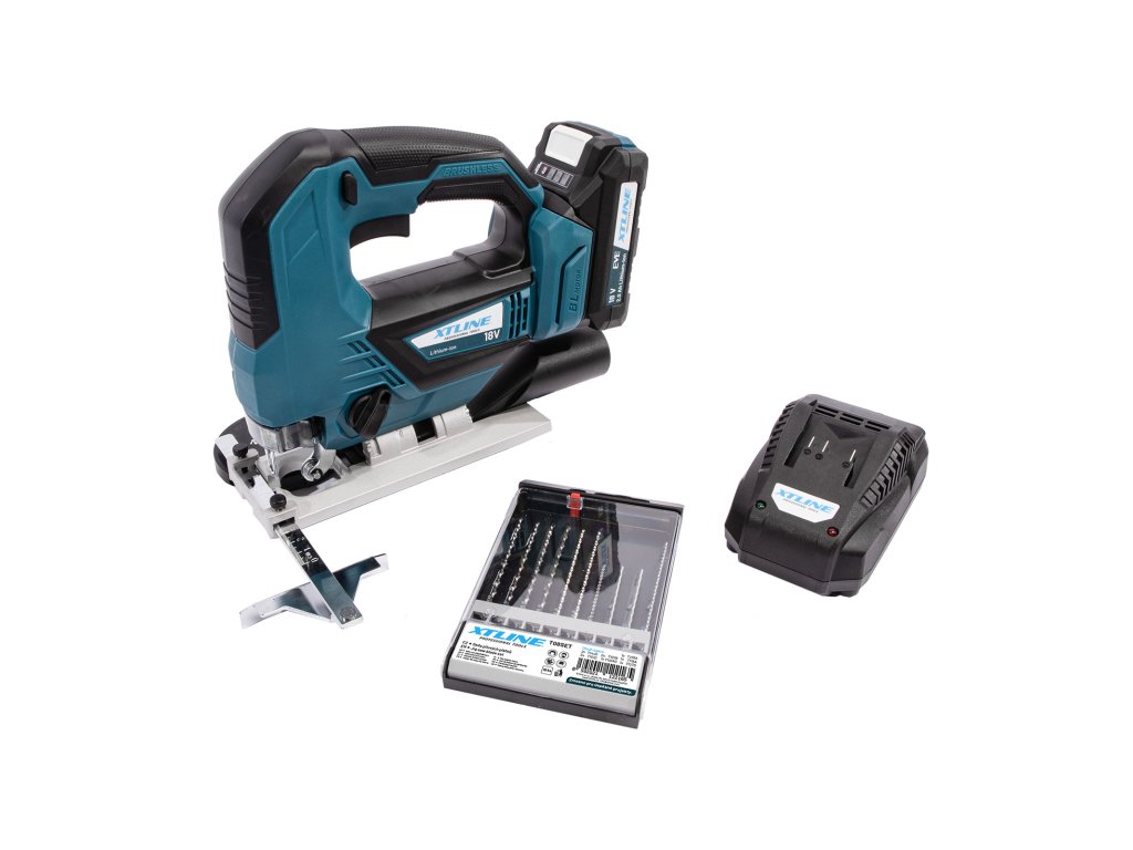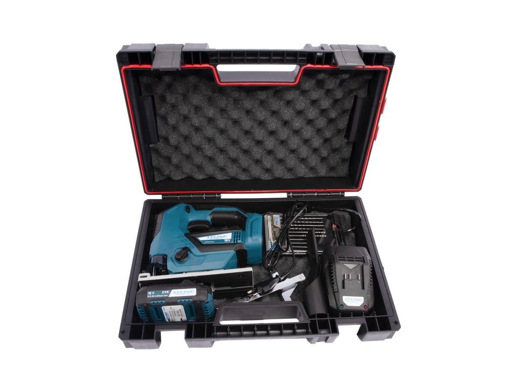 XTLINE Aku přímočará pila bezuhlíková 18 V + baterie 2.0 Ah + nabíječka 2.4 A + pilové plátky + box