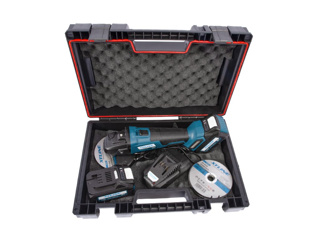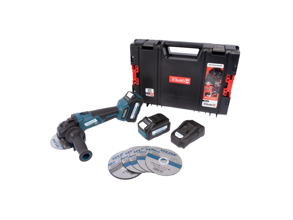 XTLINE Aku úhlová bruska bezuhlíková 18 V, 125 mm + kotouče + 2 baterie 5.0 Ah + nabíječka 3.5 A + box