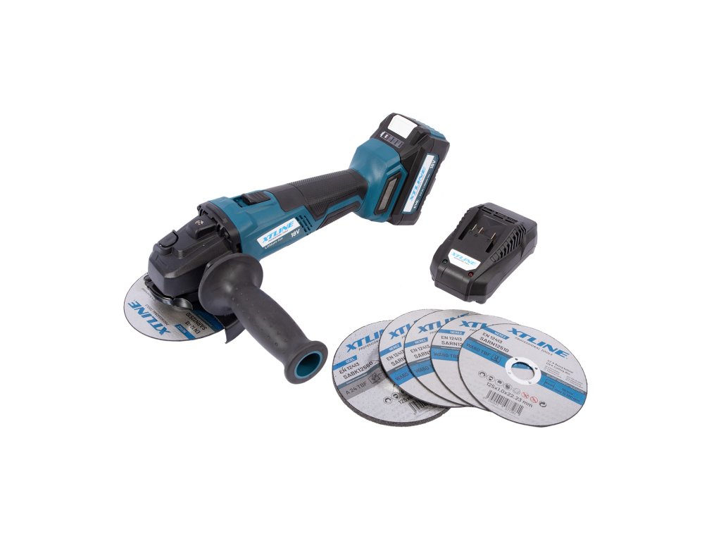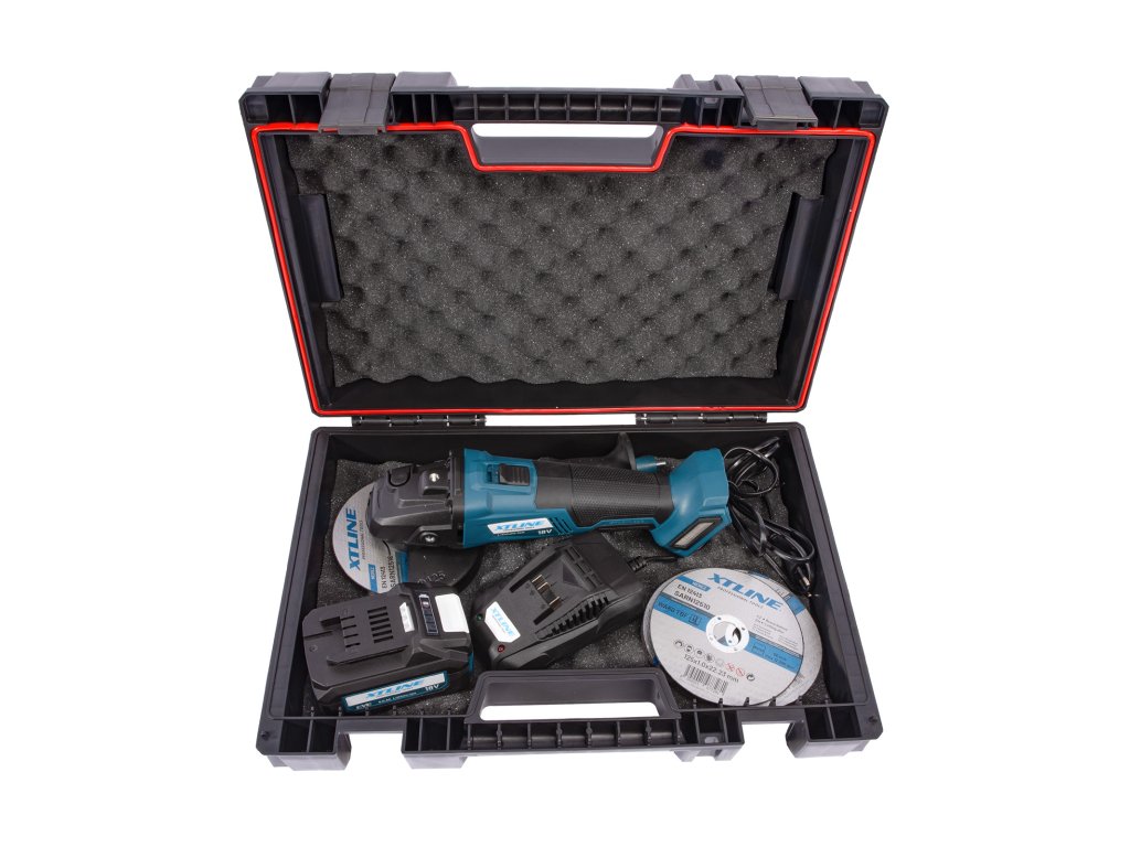 XTLINE Aku úhlová bruska bezuhlíková 18 V, 125 mm + kotouče + baterie 5.0 Ah + nabíječka + box