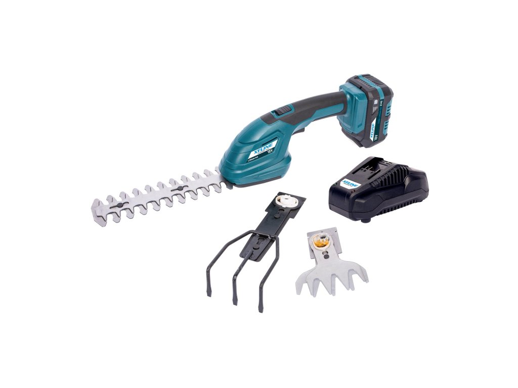 Univerzální aku zahradní nůžky 3 v 1 pro péči o trávník, keře a lehké zahradní práce. Rychlá výměna nástavců umožňuje přepínání mezi střihem trávy, keřů a mini hrabětem. Kompletní sada pro okamžité použití.