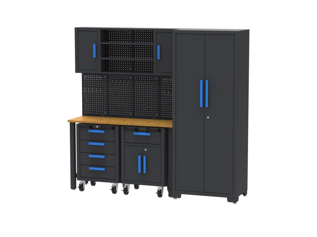 Úložný systém tvoří kombinace spodních a nástěnných skříněk, zásuvkový modul na kolečkách, police a děrované panely, které umožňují systematické a přehledné uložení nářadí, spojovacího materiálu i drobných komponentů. Díky promyšlenému uspořádání máte vše potřebné vždy rychle po ruce.