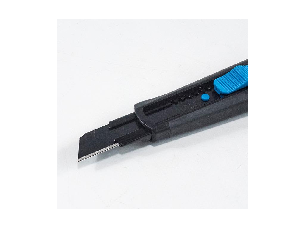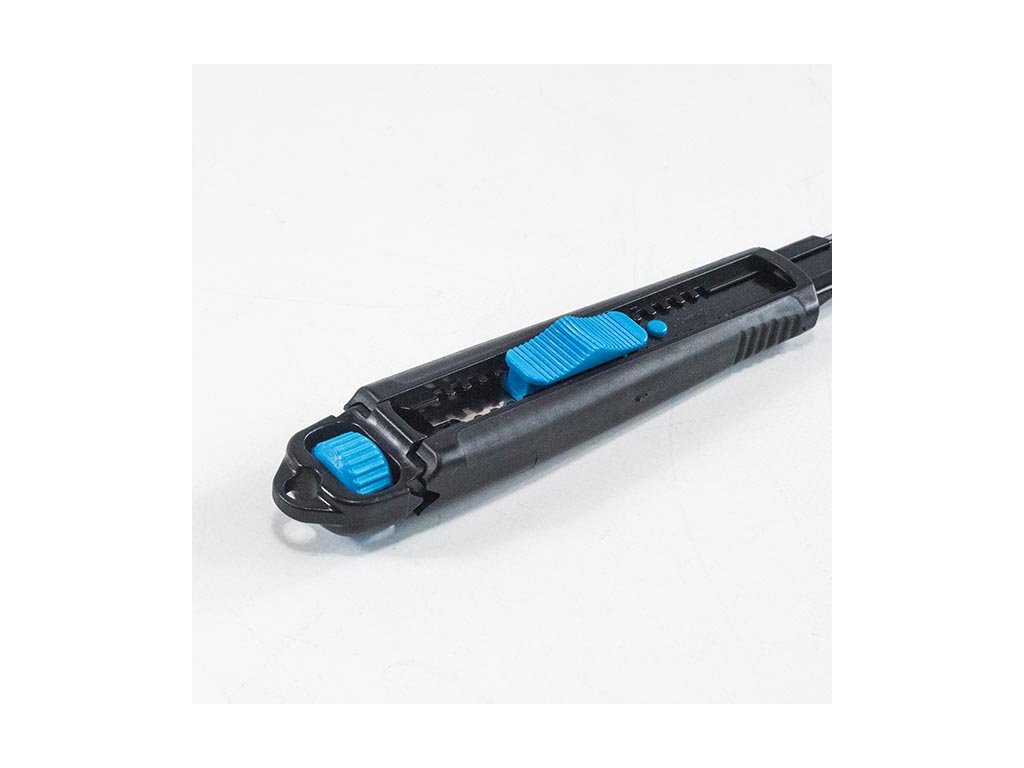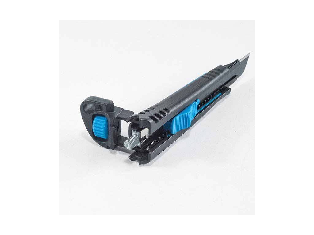 Ulamovací nůž s ABS vodící lištou. Ocelové vodítko čepele se vždy automaticky uzamkne proti pohybu. Šroubová aretace na zadní straně. Nůž má mezinárodní patent na aretaci břitu pro větší bezpečnost. Černěný povrch odolný proti korozi.