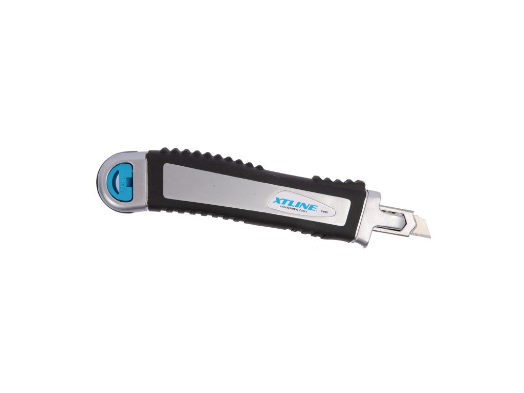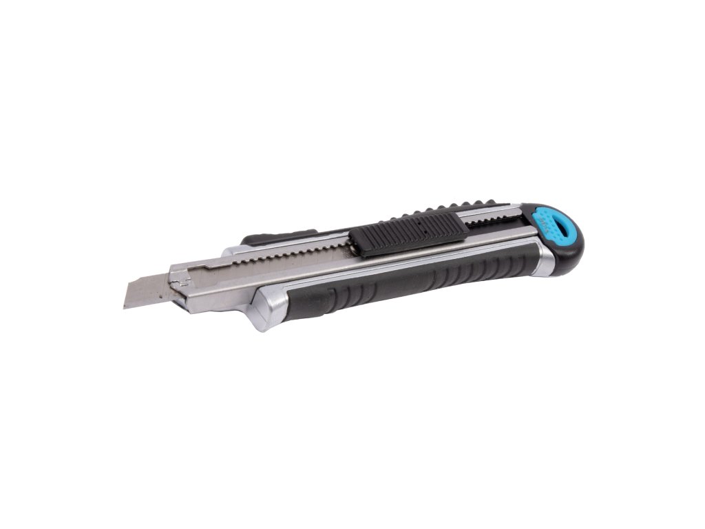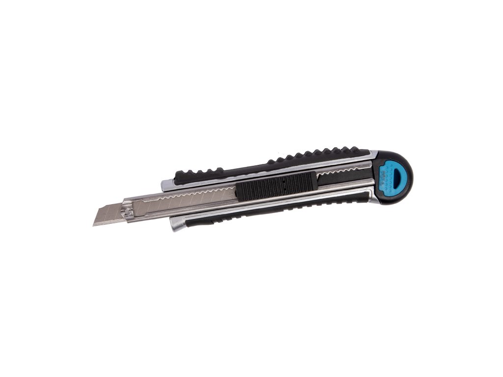 Celokovový ulamovací nůž s kovovou vodící lištou a pryžovým pláštěm. Ocelové vodítko čepele se vždy automaticky uzamkne proti pohybu a umožňuje rychlou výměnu náhradní čepele přímo ze zásobníku. Pogumovaná rukojeť s drážkami proti prokluzu. Vysouvač slouží jako zámek a rychlé výměně břitu. Vysouvací zásobník s 5 náhradními čepelemi.