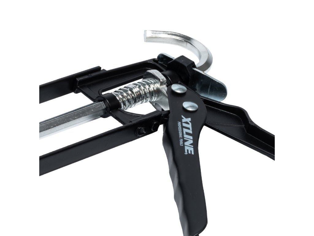 Aplikační pistole pro silikonové a akrylátové tmely. Mechanismus zpětného chodu (dripless) zabraňuje po ukončení práce vytékání tmelu z kartuše. Pevný rám odolný proti kroucení s kvalitní povrchovou úpravou. Šestihranný aplikační píst, trn na odstraňování zaschlého tmelu.