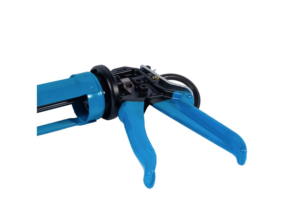 Výkyvná vytlačovací pistole na tmel. Robustní konstrukce a zesílený pojezdový mechanismus umožňuje aplikaci bez prokluzu vodící tyče. Dripless funkce umožňuje okamžitě po uvolnění ovládací páky zastavení vytlačování materiálu. Pevný kovový rám je odolný proti kroucení.