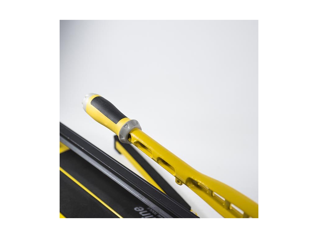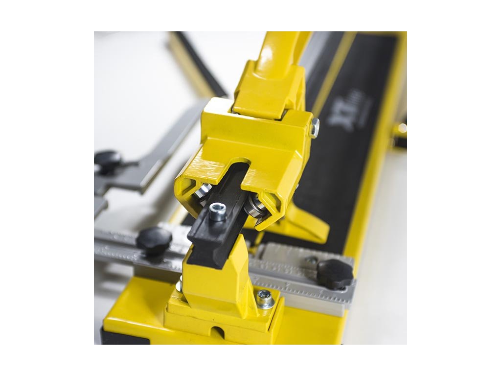 Masivní řezačka obkladů a dlažby. Ložiska uložená v kovovém pouzdře pro přesný a snadný řez. Vůle způsobená provozem lze upravit seřizovacími šrouby. Úhloměr pro přesný úhlový řez. Páková lamačka umožňuje snadné lámání dlažeb.
