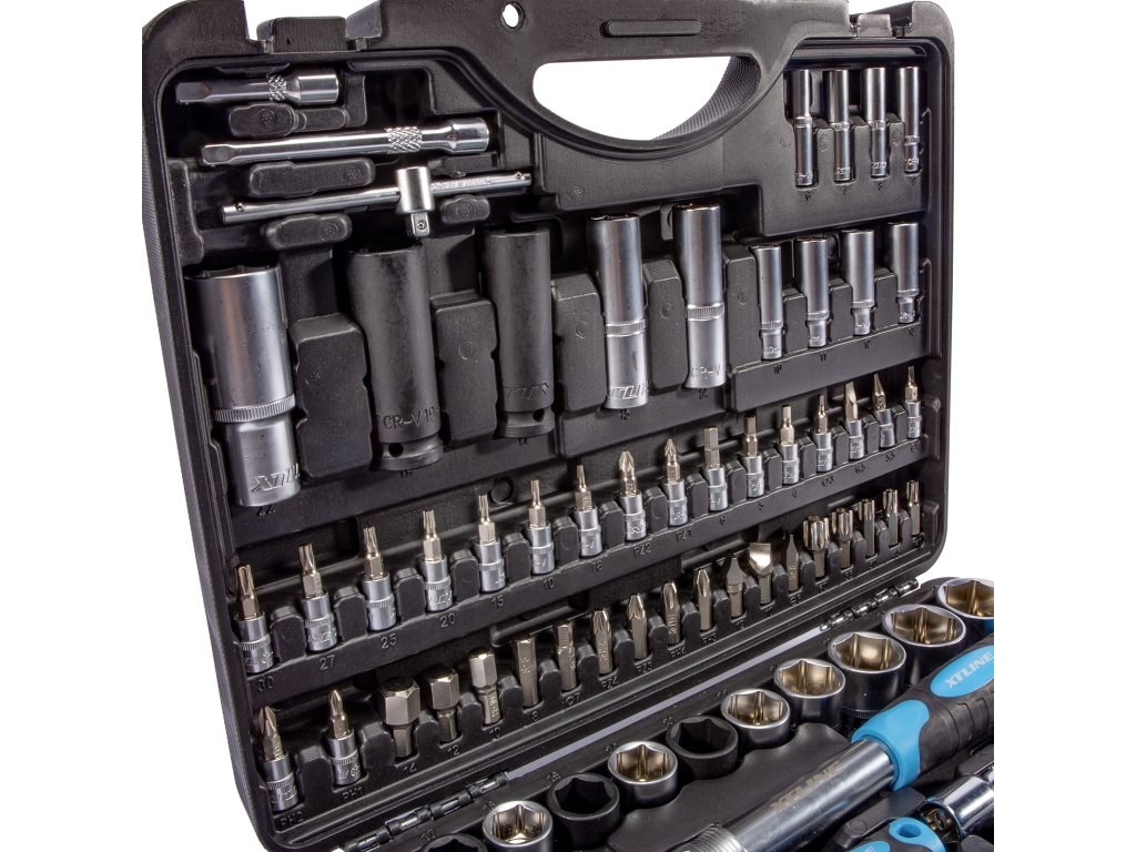Xt40108 je rozsáhlá profesionální gola sada obsahující ráčny, standardní hlavice i průmyslové hlavice vyrobené podle mezinárodních DIN standardů. Sada je určena pro dílenské, montážní a průmyslové použití, kde je vyžadována vysoká přesnost a odolnost. Všechny díly jsou z vysoce odolné chrom-vanadiové oceli (Cr-V) a mají kvalitní povrchovou úpravu proti korozi. Díky praktickému plastovému kufru jsou díly přehledně uspořádány a snadno přístupné.