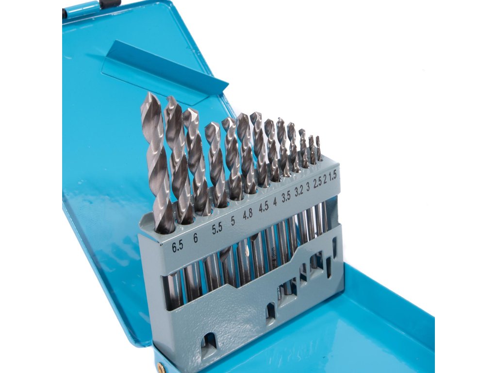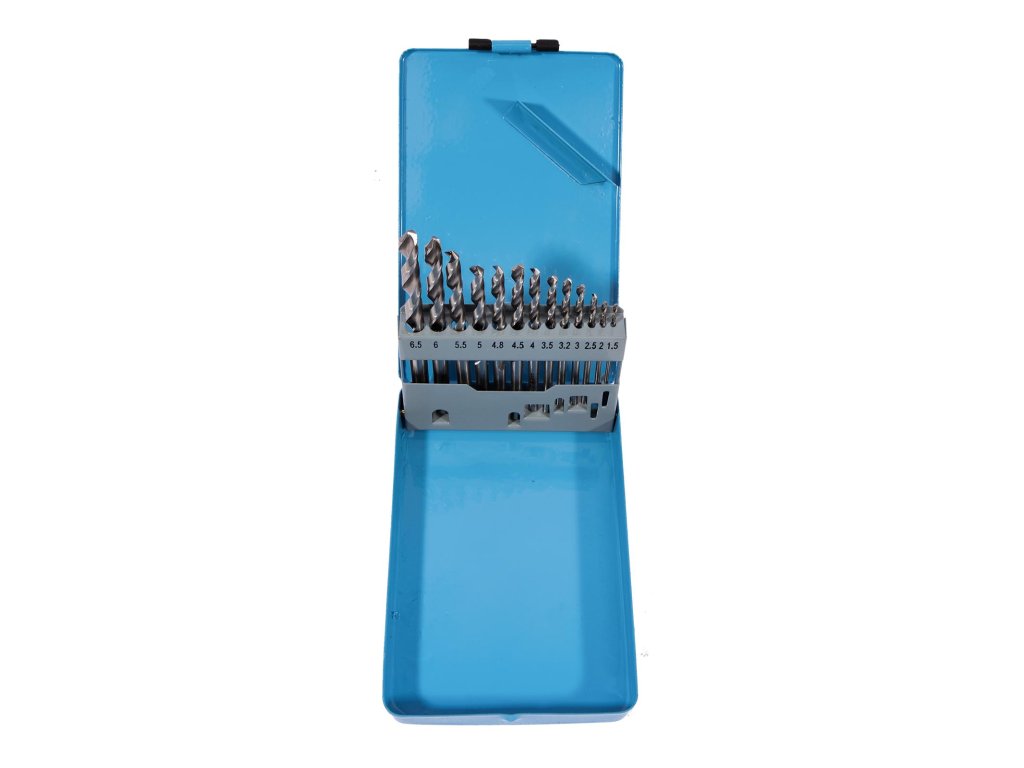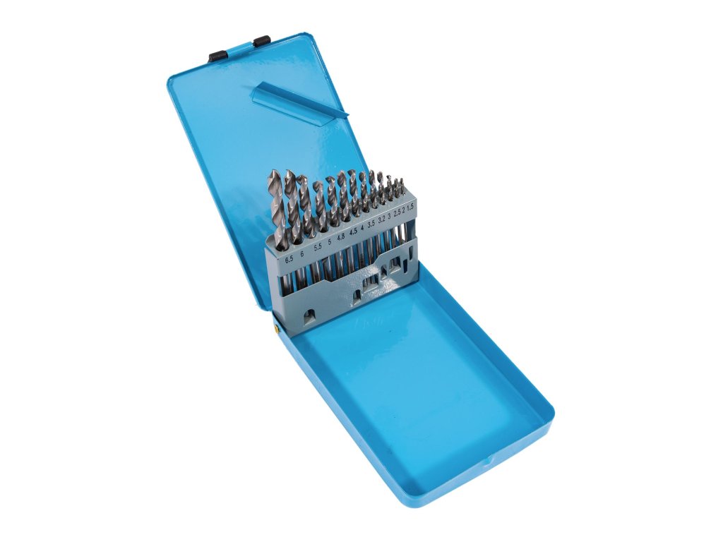 Sada vybrušovaných vrtáků HSS-G z rychlořezné oceli vyrobených dle normy DIN 338 s vrcholovým úhlem 118° pro vynikající kvalitu a přesnost vrtání. Vhodné pro vrtání různých materiálů, jako jsou legovaná i nelegovaná ocel, ocelolitina, temperovaná i tvárná litina, slitiny hliníky, bronz a mnoho dalších materiálů, u kterých hraje hlavní roli přesnost vyvrtaného otvoru. Jednotlivé rozměry vrtáků v sadě jsou odstupňovány po 0,5 mm.