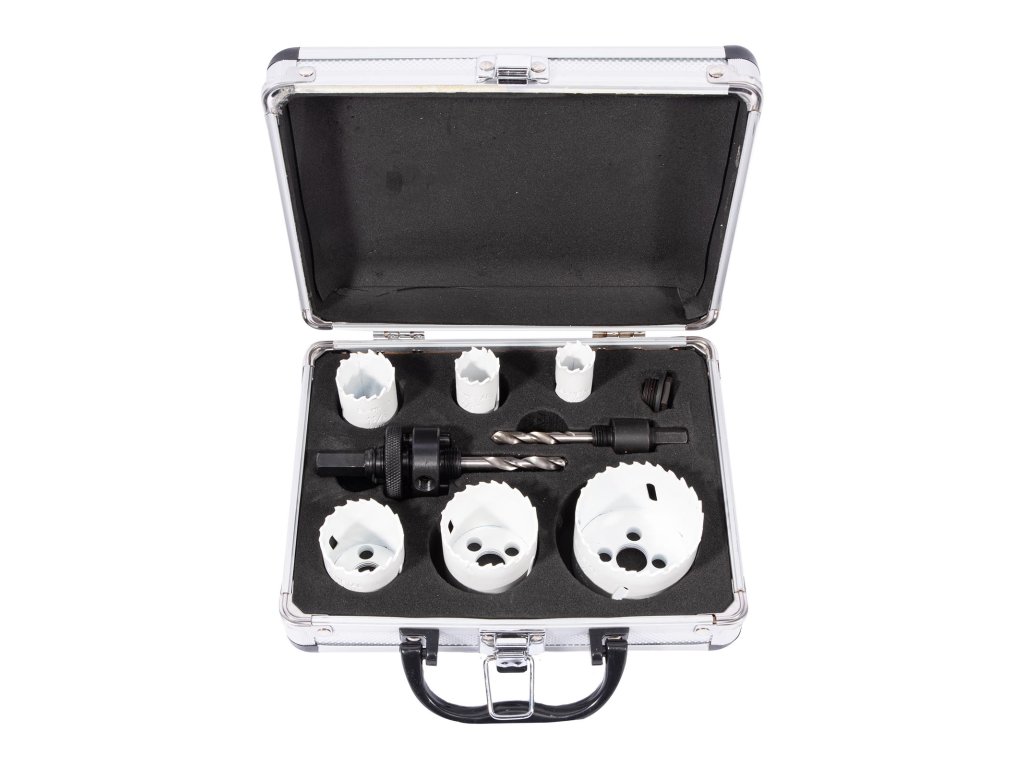Sada bimetalových vykružovacích korunek určená pro přesné a rychlé vyřezávání otvorů v různých materiálech s maximální tloušťkou do 8 mm.