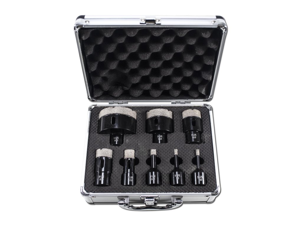 Sada obsahuje korunky průměrů 6, 8, 10, 20, 30, 35, 50 a 68 mm. Díky výšce diamantové vrstvy 10 mm a maximální hloubce vrtání 25 mm zvládnou přesně a rychle vyvrtat otvory pro vodovodní trubky, elektroinstalace či montážní prvky. Kvalitní průmyslový diamant zajišťuje dlouhou životnost a vysokou odolnost proti opotřebení.