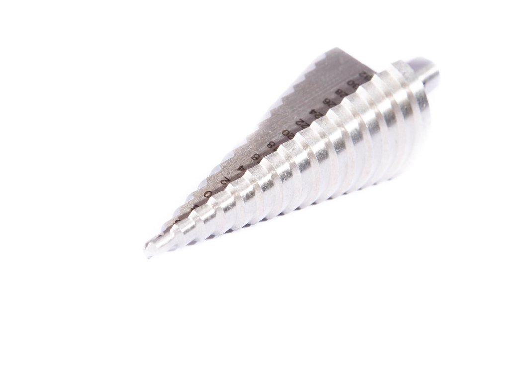 Vrták stupňovitý slouží pro vyvrtání kruhových otvorů v ocelových plátech (i měkčí materiály jako dřevo, plast...).Plynulé a bezhrotové vrtání bez deformace materiálu. Vhodné pro aku/elektrické vrtačky.