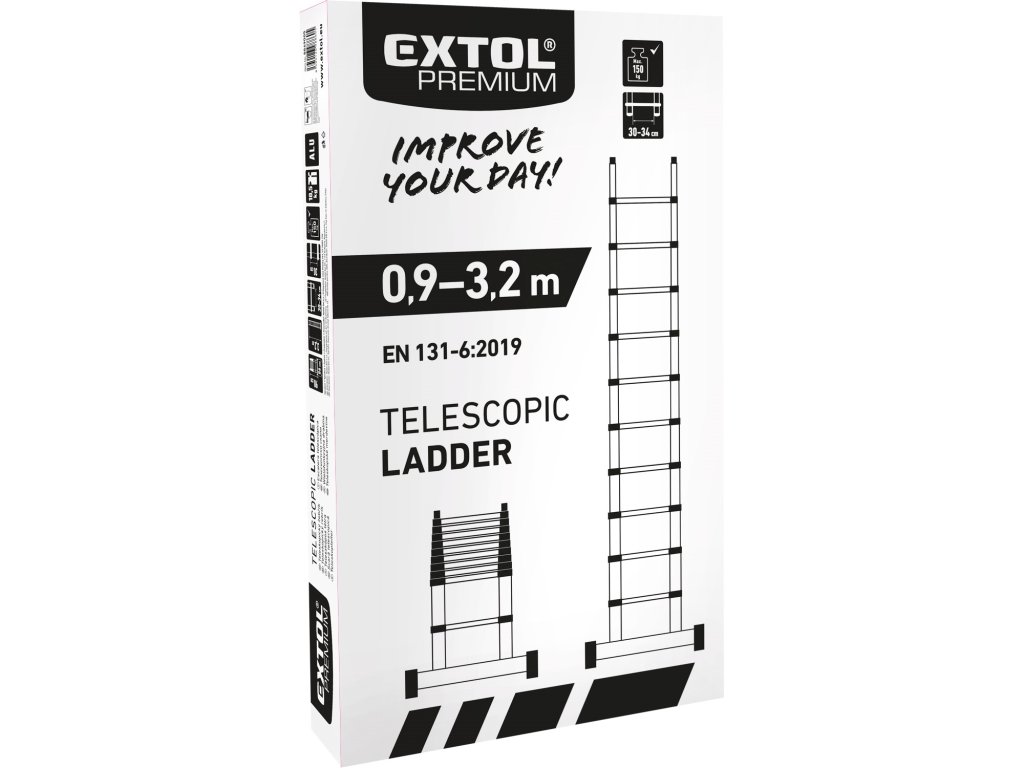 doplňující parametr | max. výška 3,2m, rozměry složeného žebříku v.90 x š.86cm, nosnost 150kg, 10 příček, hmotnost 10,5kg, šířka základy (v místě na p |